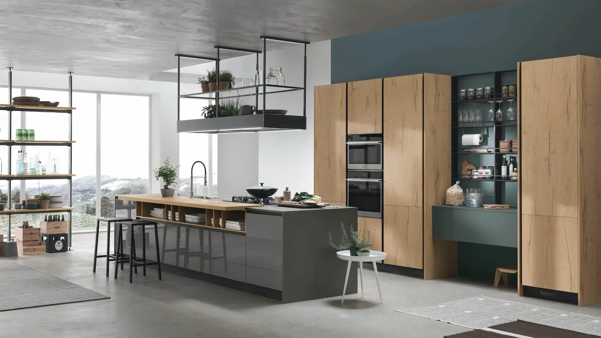 La cucina moderna Infinity di Stosa è bella, funzionale, flessibile. La sua estetica accattivante si basa in primis sulla potenza espressiva dei materiali e sul loro abbinamento: ecco quindi che il legno, naturale e caldo, incontra l’innovativo Fenix o il Pet lucido. Oppure il metallo. I contrasti sono anche cromatici, studiati nel dettaglio per restituire un effetto di grande impatto. Al quale contribuisce anche il grande carattere degli elementi geometrici. Qualche esempio? L’anta a trapezio che crea dei tagli diagonali sui pensili, il top quadrato in legno che sporge dalla base e diventa un bancone snack, la penisola diagonale con la sua forma decisamente insolita.